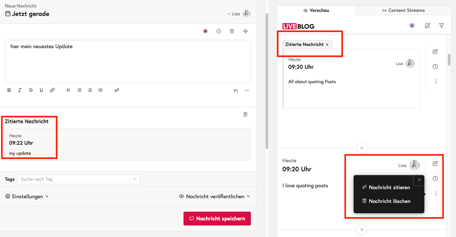 Die Funktion findest du in der rechten Liveblog Vorschau, indem du auf die drei Punkte beim gewünschten Post klickst. Dort kannst du die Option „Nachricht zitieren“ auswählen. Der zitierte Post wird anschließend unter dem Rich Text Feld im Editor angezeigt, sodass du den Inhalt ergänzen oder kommentieren kannst, ohne den Original-Post zu verändern.