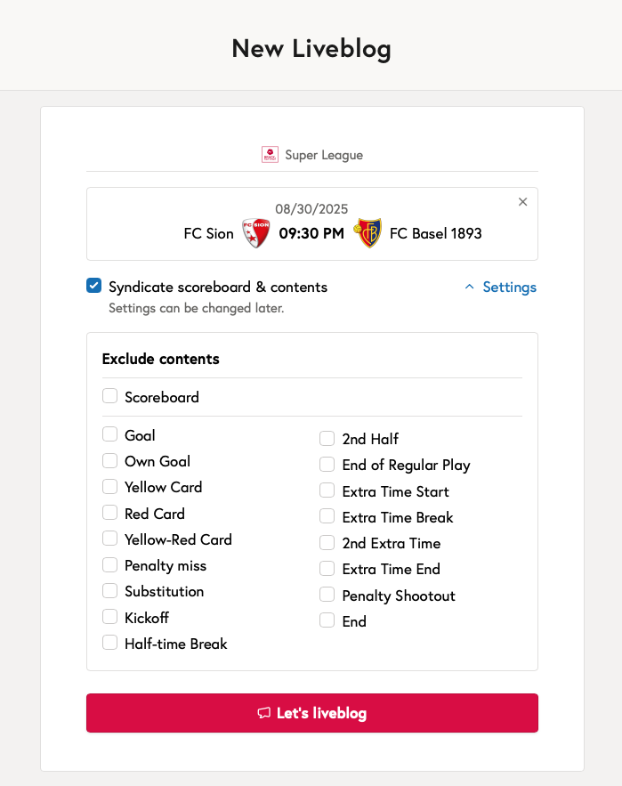 - Match start: From the start of the game, and with syndication enabled, selected events are automatically sent to your liveblog.